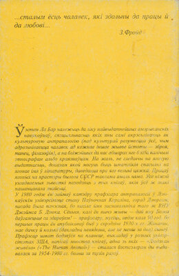 3 Як ужо псіхааналіз арыентуецца на цела, а тое, у функцыя-нальным сэнсе, ёсьць кросс-культуравым фэнаменам (г. зн. маг-чыма разглядаць чыннасьці людзкага цела ў нейкай культурнай пэрспэктыве), дык няма чаму дзівіцца, што культурова-асабіс-тасьцявыя дасьледаваньні групавога этасу таксама пачынаюцца ў межах пэўных псіхааналітычных рамак. Заклапочанасьць псіхааналізу мэтамі й сімвалічным зьместам мысьлення робіць яго яшчэ й прыдатным, да таго ж адзіным прыдатным з усіх на-прамкаў псіхалогіі, шляхам дасьледавання міту й рэлігіі. Толькі шкадаваць, што “сацыяльная антрапалогія” мела дэградаваць да нейкае нікчэмнае “алгебры крэўнага сваяцтва", якая апантана шукае ўзоры ды пабудовы, калі шмат якія з гэткіх людзкіх ад-носін ды сувязей магчыма тлумачыць не праз структурныя кан-цэпцыі, але псіхаананітычна знаходзячы для іх функцыяналь-ныя сэнсы й значэньні.