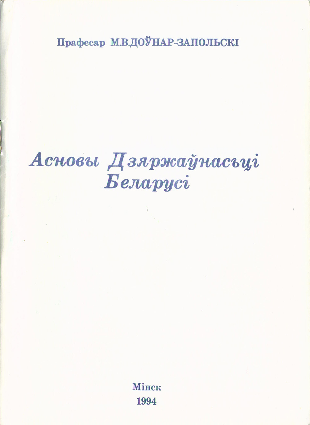 Магутная рэпрэсгўнаідэалаггчная машына паволі набірала хуткасць, падмгная пад сябе любйя праяўленні навуковай творчасці, якія не ўкладваліся ў рамкг стандартнйх падйходаў і канцэпцйй. Але вучонй не змог, не пажадаў прйстасоўваць свае поглядй да змяняючйхся ўмоў. Бо закладзенй гэтйя поглядй бйлг з юнацтва і аказаліся надзвычай устойлівймі. Яшчэ ў 1888 годзе ў артыкуле “Беларускае мінулае” ДоўнарЗапольскі адзначаў, што беларускі народ мае ўласную гісторйю і вйсокую кулыпуру, а значйць,заслугоўвае таго, каб бйць раўнапраўнйм членам сям’і славянскіх народаў. Праз трйццаць год ён паўторйць тйя ж словы ў брашурй “Асновй дзяржаўнасьцг Беларусі”. Толькі зараз гісторйк зробіць гэта на больш сталйм узроўні, і тыя палажэнні, якія некалі вйказваліся ў артыкуле “Беларускае мінулае”, увасобяцца ў стройнай навукова абгрунтаванай мадэлі, набыва/ючй характар канцэпцыг палітычнай гісторйі.