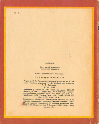 Здадзена ў набор 15.12.81. Падп. да друку 23 02 82 Фармат 70X84'/,.. Папера афс. № 2 ГарТура часоЛная рубленая Афсетны друк. Ум. друк. арк. 2,18. Ум. фарб.адб. 8,72. Ул.выд. арк. 2,06. Тыраж 50 000 экз Зак. 2199. Цана 15 к.