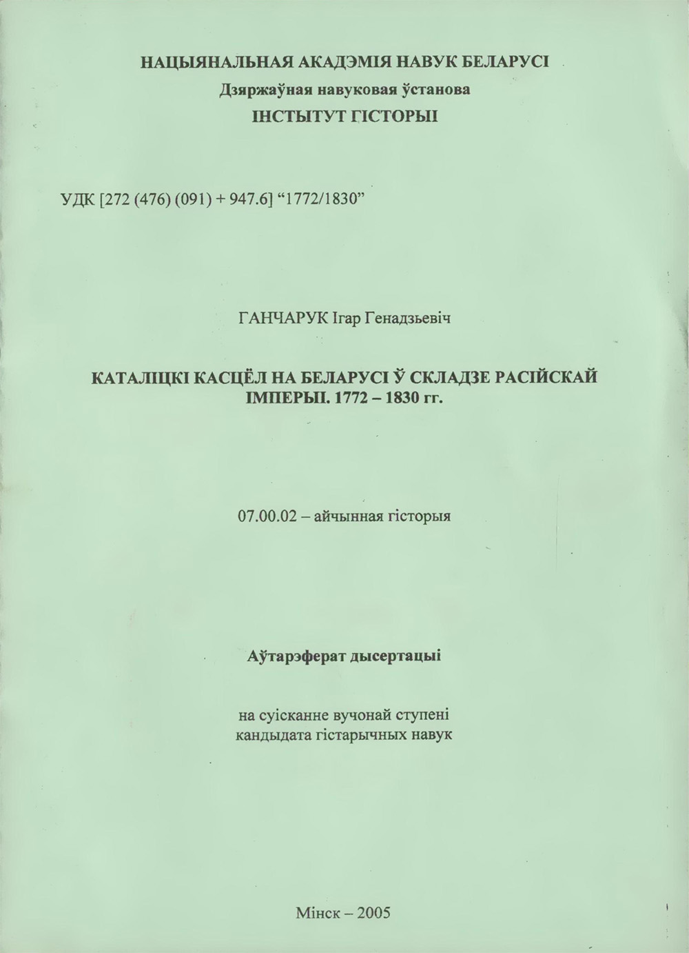 КАТАЛІЦКІ КАСЦЁЛ НА БЕЛАРУСІЎ СКЛАДЗЕ РАСІЙСКАЙ ІМПЕРЫІ. 1772 1830 гг.
