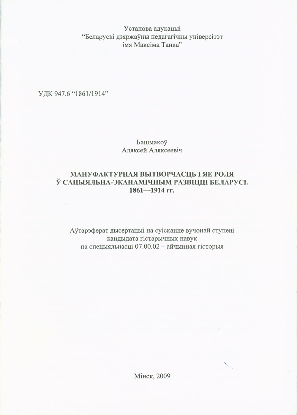 МАНУФАКТУРНАЯ ВЫТВОРЧАСЦЬ I ЯЕ РОЛЯ Ў САЦЫЯЛЬНАЭКАНАМІЧНЫМ РАЗВІЦЦІ БЕЛАРУСІ. 1861—1914 гг.