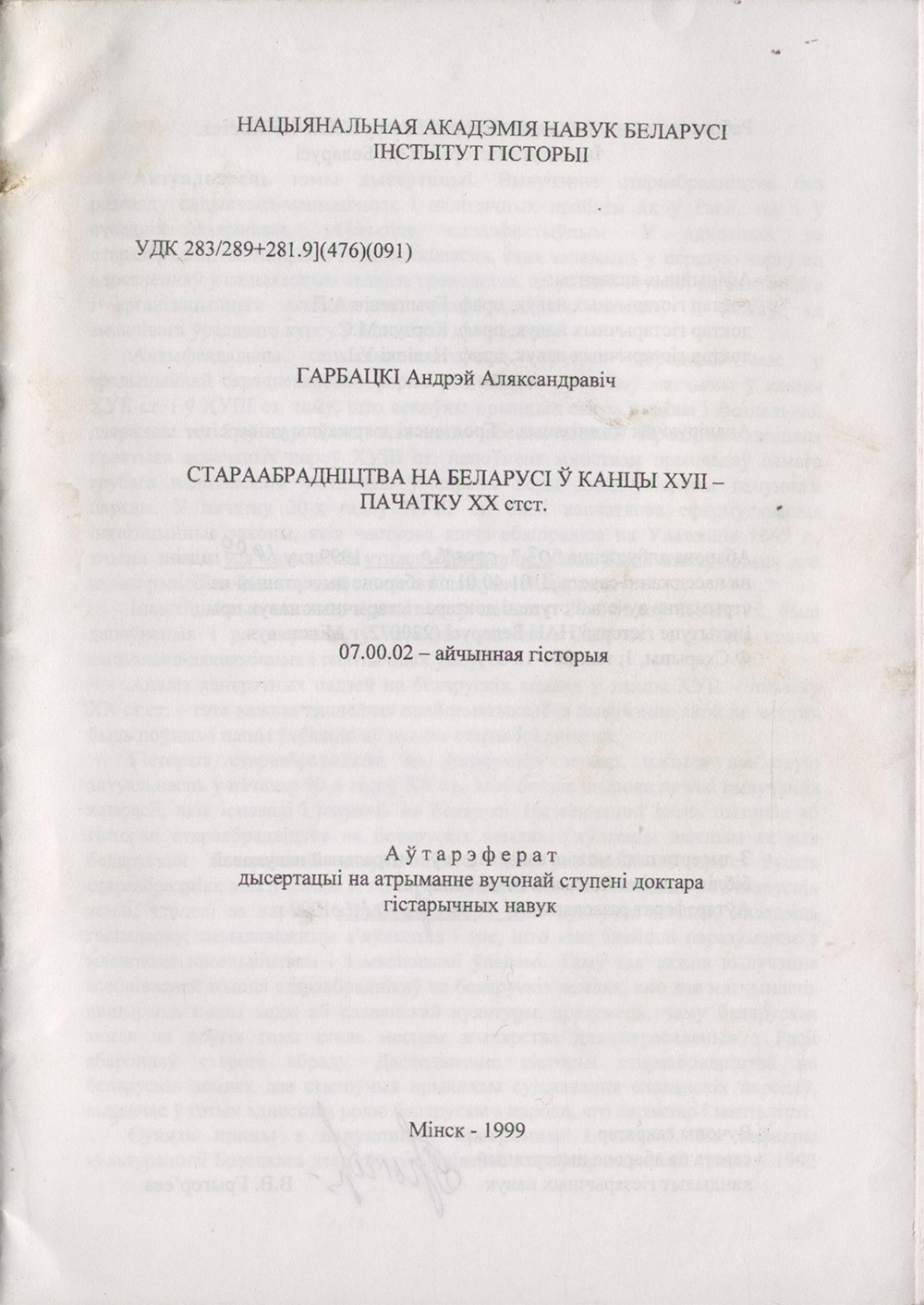 Аўтарэфератразасланы “2f ” Хі>еІрт?^^1999 г.