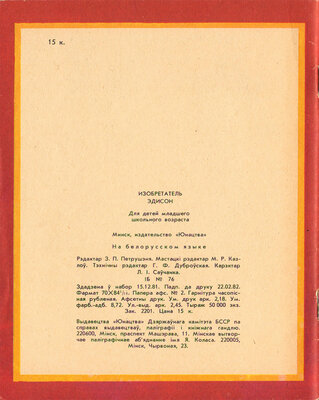 Здадзена ў набор 15.12.81. Падп. да друку 22.02.82. Фармат 70Х841/іб. Папера афс. № 2. Гарнітура часопісная рубленая. Афсетны друк. Ум. друк арк. 2,18. Ум. фарб.адб. 8,72. Ул.выд. арк. 2,45. Тыраж 50 000 экз. Зак. 2201. Цана 15 к.